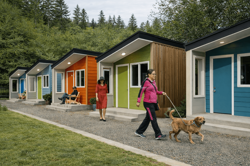Housing 400–600 sq ft private units with individual outdoor space. Sensory-informed design: acoustic treatment, reduced visual clutter, adjustable lighting, clear wayfinding. Flat $300/month rent with no income verification, no bureaucratic complexity, compatible with SSI and SSDI.